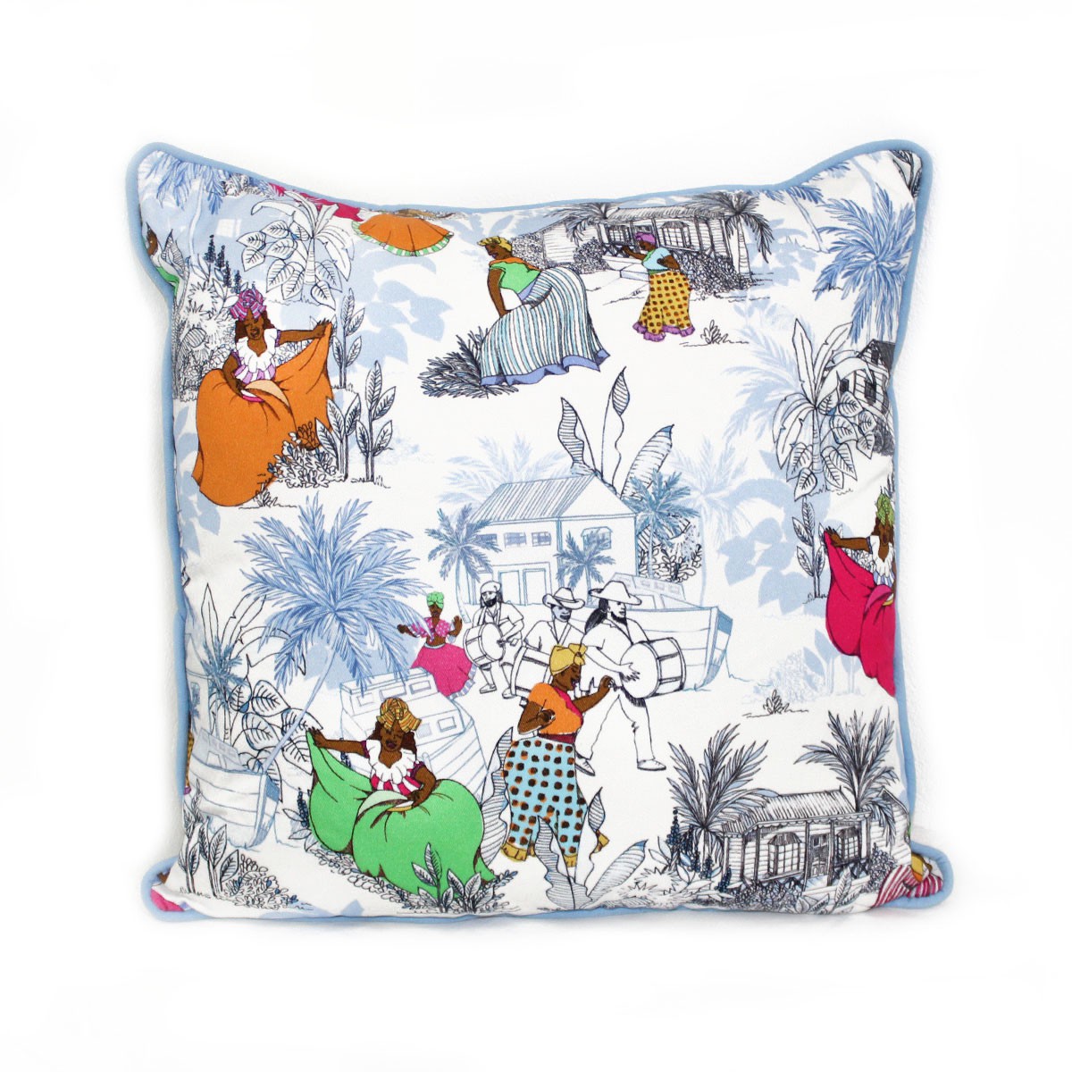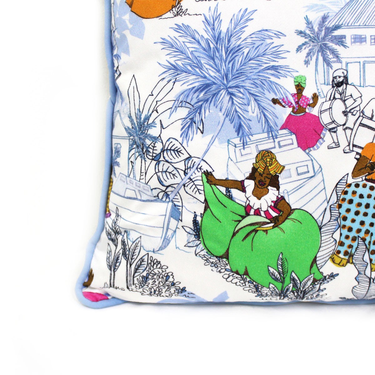 Printed cotton front with plain poly-cotton back, piped edges and zipper fastening. Cushion cover fits an 18” x 18” cushion.