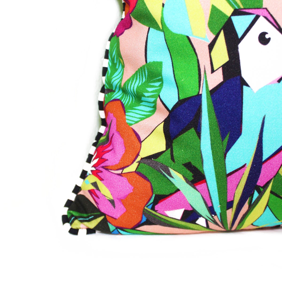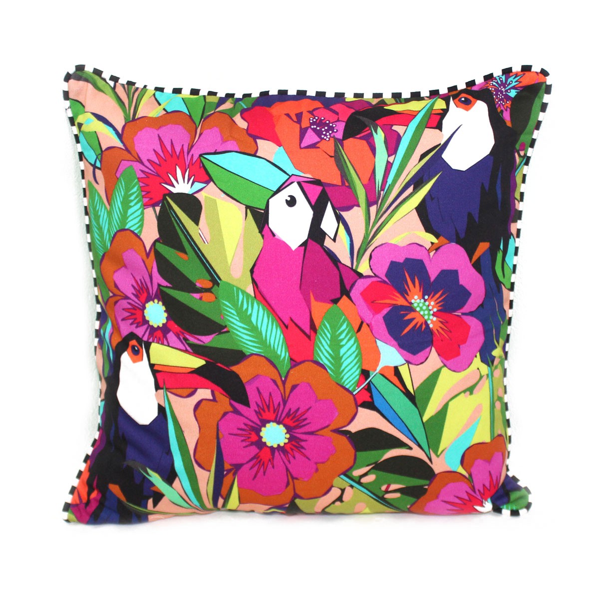 Printed cotton front with plain poly-cotton back, piped edges and zipper fastening. Cushion cover fits an 18” x 18” cushion.