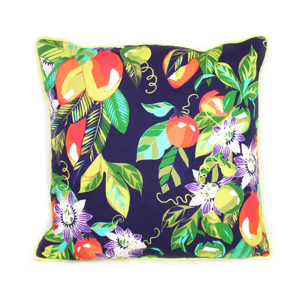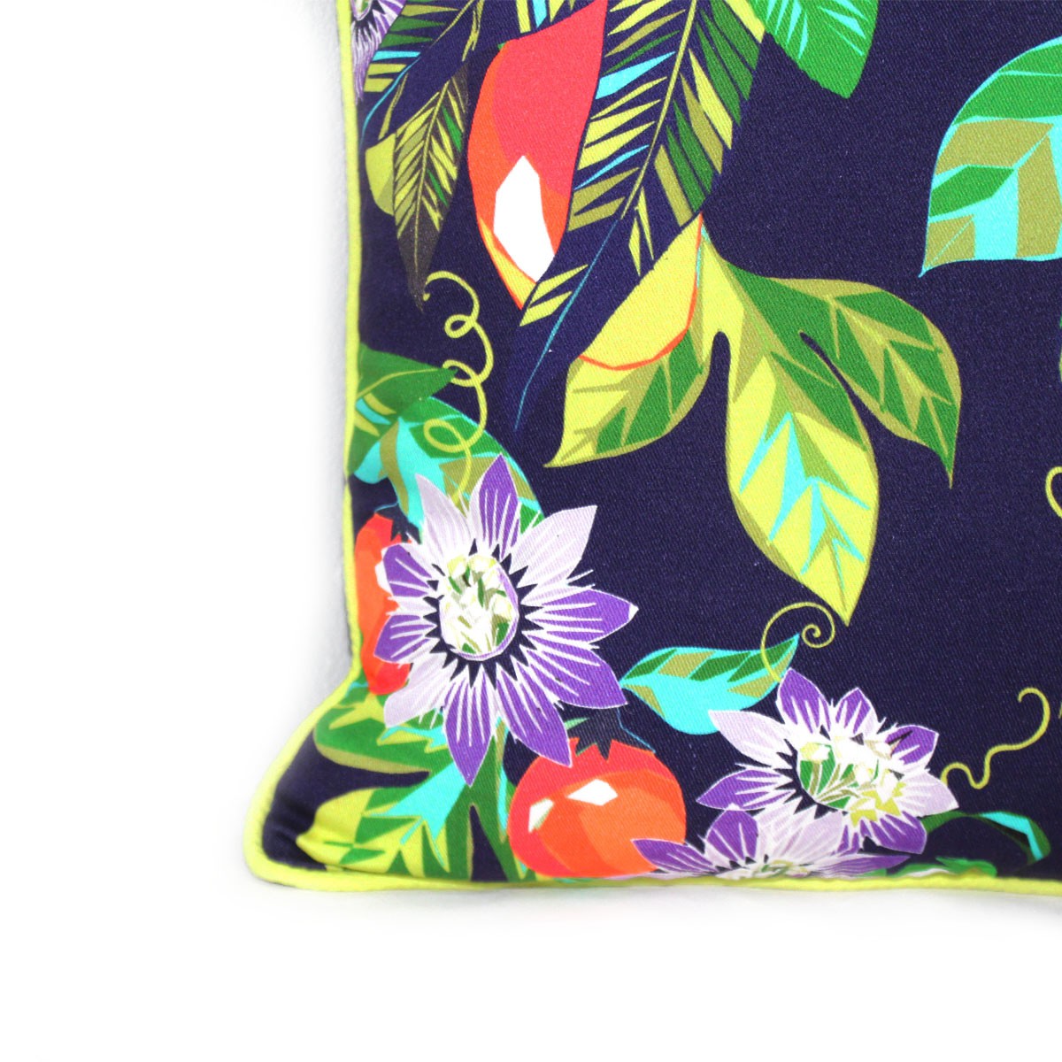 Printed cotton front with plain poly-cotton back, piped edges and zipper fastening. Cushion cover fits an 18” x 18” cushion.